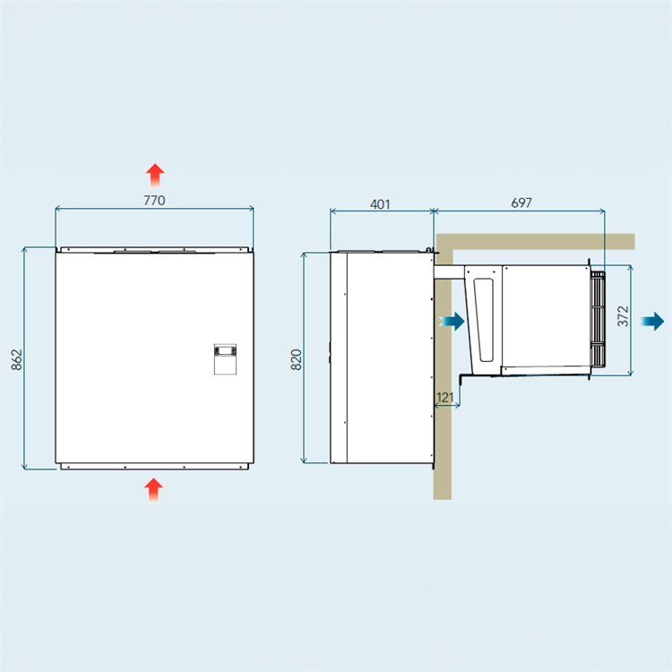 Luftkylt enhetsaggregat för genom vägg- eller sadelmontage, med hölje av epoxilackerad, vit stålplåt.