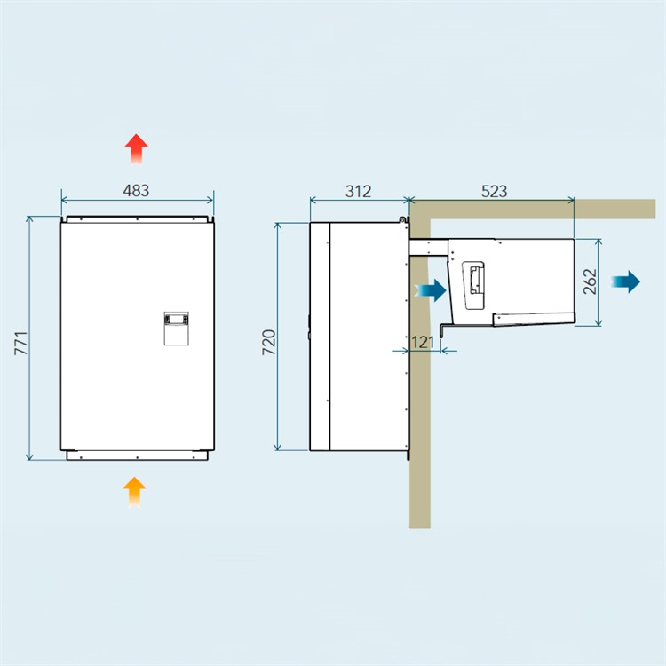 Luftkylt enhetsaggregat för genom vägg- eller sadelmontage, med hölje av epoxilackerad, vit stålplåt.