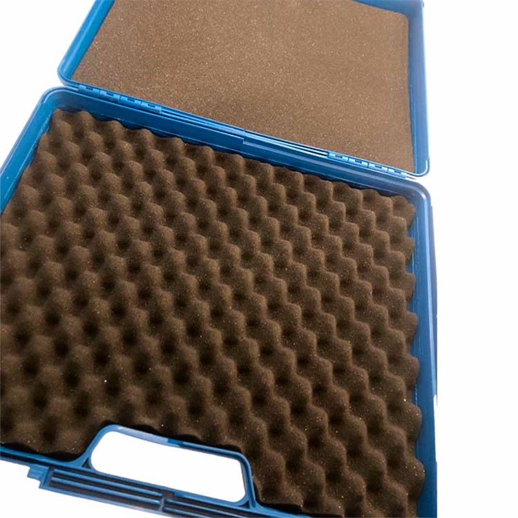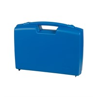 Väska i blå hårdplast. Mjuk skumplast på insidan som håller verktygen på plats.